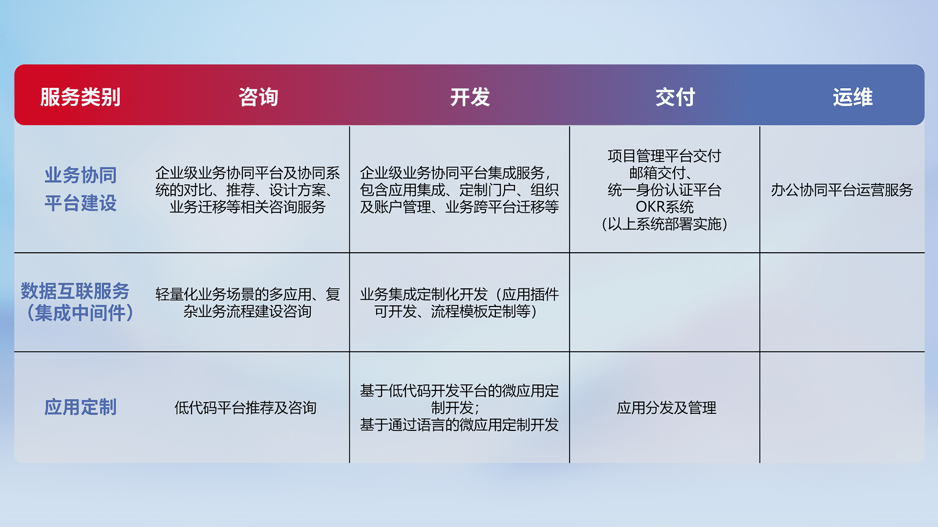 针对钉钉、、、、企微、、、IDaas等平台级产品提供产品的规划、、方案、、交付、、、定制化开发等服务,,,,实现如统一协同办公、、、、智能客户服务、、、混合会议管理、、、智能数据查询、、等业务场景,,,实现数字化转型。。。